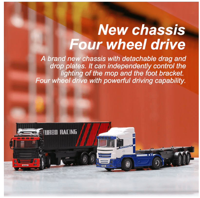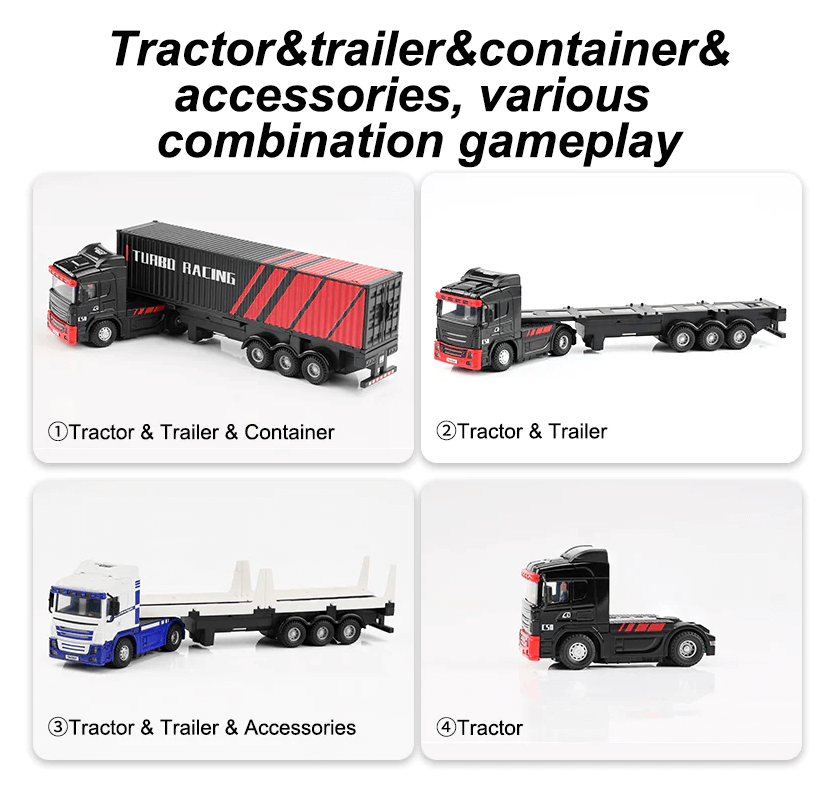 Le camion Turbo Racing au 1/76 vous offre un contrôle précis sur diverses fonctions. Cette magnifique réplique de semi-remorque est doté de plusieurs feux (feux de route/de croisement, des feux de calandre avant, des feux de toit (en quatre couleurs), des feux de siège, des antibrouillards, des feux d'avertissement, des feux de freinage, des feux de recul et des clignotants). Elle vous fera vivre une conduite authentique, avec des sons de direction, des sons de klaxons ainsi que des sons de voyant d'avertissement ). Le cadre de support de la remorque peut être ajusté pour permettre la séparation de la remorque et de la tête de cabine. La tête de cabine peut pivoter à 180 degrés. Personnalisez votre expérience de conduite avec des fonctions de trim, ainsi que trois réglages de vitesse depuis la télécommande (élevé, moyen et faible).Le camion RC Turbo Racing à l'échelle 1/76 offre un divertissement de haute technologie . Avec une Lipo 150mah intégré, vous pouvez rouler jusqu'à 40 minutes. La charge ne dure que 30 minutes avec le câble USB-C inclus. La remorque est à monter, pas besoin d'outils. Caractéristiques :
