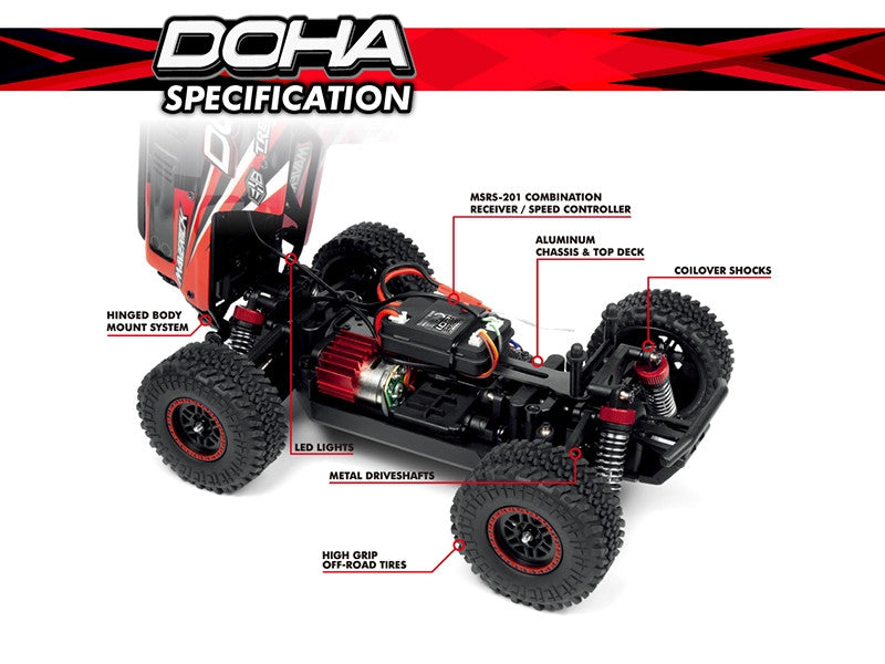 Le Monster est équipé d'amortisseurs de couleur assortie à la carrosserie, d'un dissipateur thermique du moteur pour un refroidissement efficace et de roues aux détails complexes, contribuant à la fois aux performances et à l'esthétique. Alimenté par un moteur optimisé de taille 370, le DOHA offre une vitesse de pointe et une accélération impressionnantes.